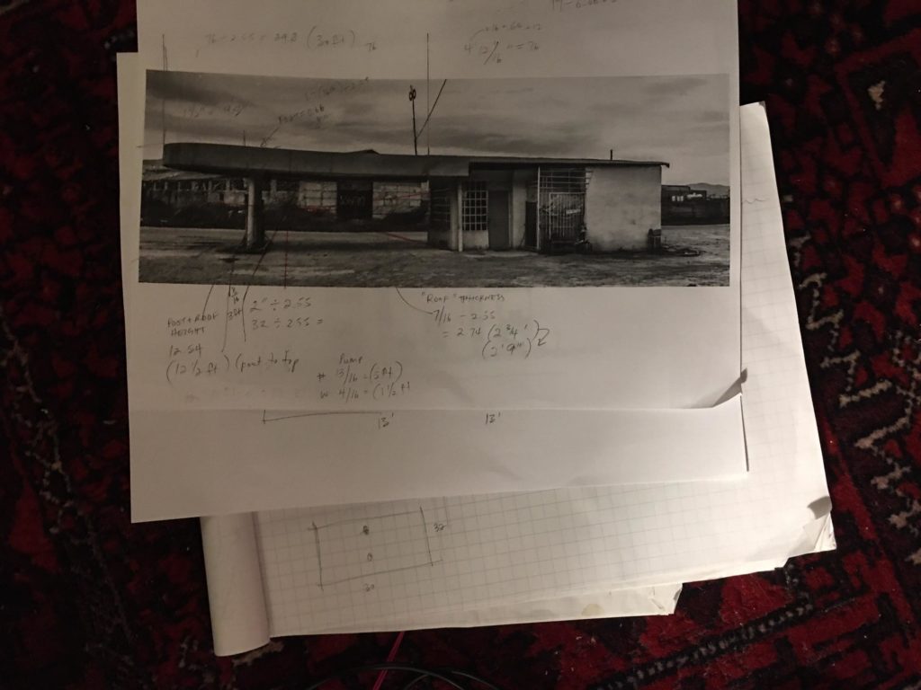 Using this building in this photo by Paul J Bucknell as a starting point for measurements, I used the door as my point of reference (assuming it was 80 inches high) for the “t” point I’m looking for and measured out the dimensions I might base my model on. I also used plans for a modern Sunoco station signage that I found to fill out the width between the pumps which you can’t see in this photo. I don’t plan to have the building itself in the shot, so I am not building that, but I wouldn’t want to rule it out for later.