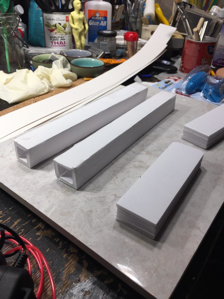 Below, the posts for the roof and base models for the gas pumps that will appear just behind the posts are made, newly glued and drying. I plan to sand the curves into the pumps, one anyway, maybe two if I want to shoot this from other angles. I did a little testing and hoping this will work to create the right silhouette shape I’m looking for. Modern pumps are very angular but in the past they had curves. I think, I hope, the curves will get just enough to suggest on a subconscious level that the station might be from another time.